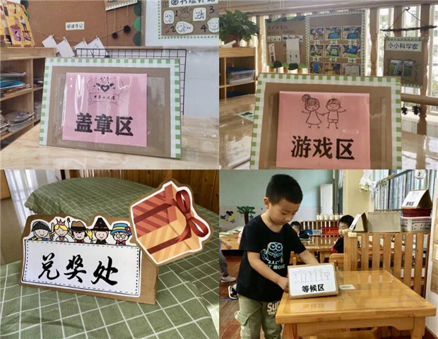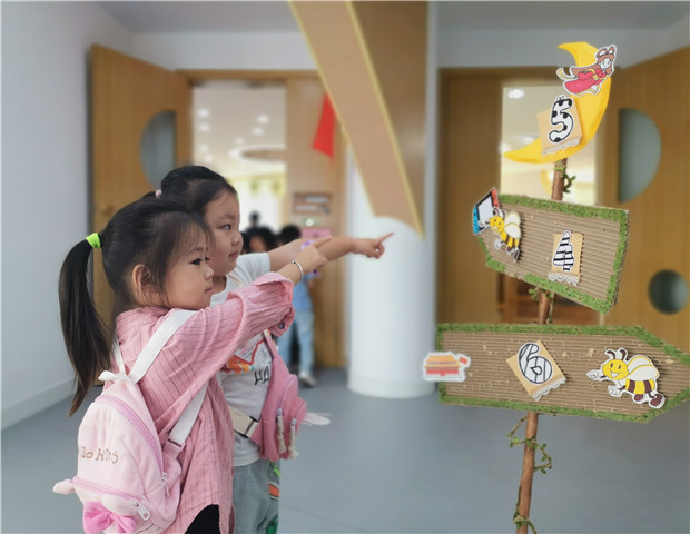 每一个教室就是一个游戏场,带给孩子们的是多种选择和欢乐,但同时也是一种挑战。为了帮助幼儿在较短的时间内找到心仪的游戏场馆,学校在大厅及楼梯转角处张贴了以万里长城、京剧脸谱、最美青花、二维码等元素组成的楼层导览图,它既是孩子们的“小导航”、家长们的“沟通桥”,又是隐形的“教育墙”。而幼儿小向导和家长志愿者的加入,更助力小班的萌娃们也能一起加入、感受乐享节日的快乐。承载“乐享”节日游戏场的打造,幼儿在教师的有效助推中体验“小主人”的喜悦。