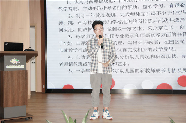 活动伊始,吴紫阳副园长宣读了“师徒结对”名单,希望新生代们能在师傅们指引和助推下快速融入,加速成长。而师傅队伍中骨干教师、年级组长和配班成熟老师的积极加入,相信也会让这一对对组合有更多的精彩绽放。徒弟代表陆琰柯老师和师傅代表戴洁老师,分别庄重地宣读了师徒职责。师徒共同成长的过程,是有目标、有计划、分阶段的蜕变过程,希望每一对师徒都能够寻方向、明职责,更好地落实到行动中去。