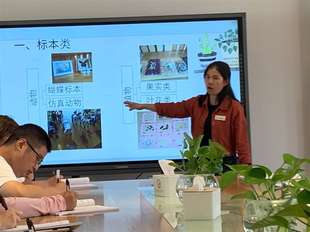 小、中、大各三个班级分享班级特色的自然工作室创设方案,徐倩老师带来了她们的班级特色:制作树叶书签、制作动植物标本,有利于幼儿更直观的观察;章梦吉老师在教室里放置了透明水培器皿,幼儿们在观察植物的同时既可以看到植物的生长也可以看到植物的根茎;徐银侠老师在班级里提供了有关动植物的书籍和仿真动物,幼儿们可以更深入的了解,在探索的过程中增添了更多乐趣。