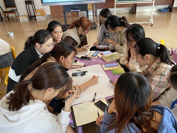 活动中,各年级组围绕三个话题展开了激烈的讨论,分别是阅读区和语言区的区别与联系及活动主要形式、目前语言区存在问题与解决策略、语言区环境的营造及材料的有效投放。