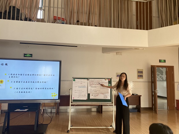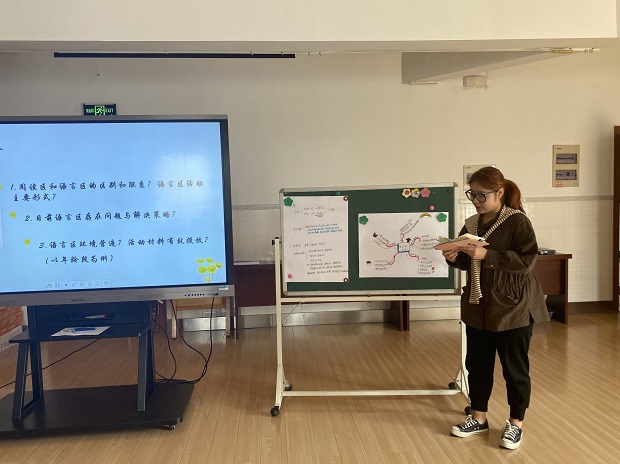 在一阵头脑风暴后,各年级组选出一位主讲老师进行了话题的分享。小班年级组由刘红老师为代表,提出阅读区是语言区的组成部分,语言区涉及的范围更广还包括了视听、书写、表演等功能。活动的主要形式围绕“听”、“说”、“读”、“写”四部分展开还可以增加一面互动墙。