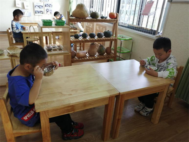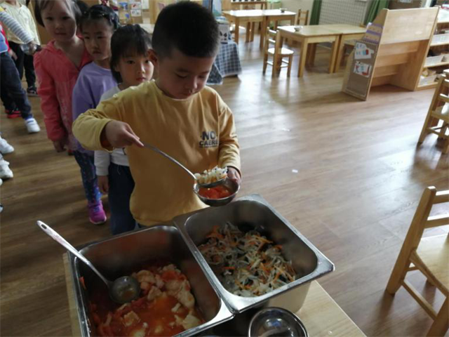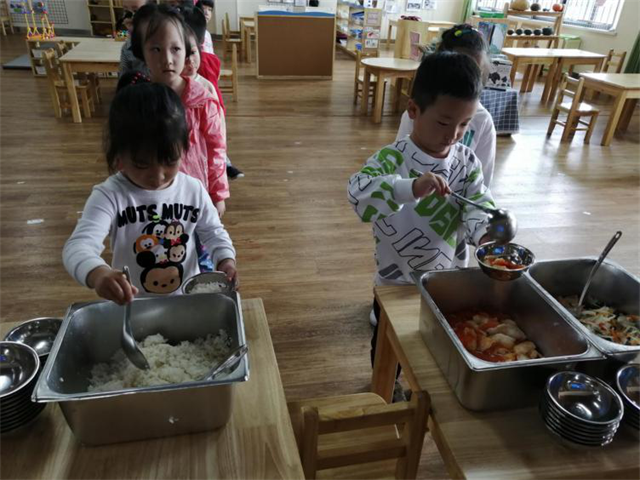 “食育”不仅仅是语言教育,更要用行动表现出来。你瞧,孩子们在午餐能够自觉排队,自主盛餐,在进餐过程中一手扶碗一手拿勺子,吃多少盛多少,没有浪费的现象。