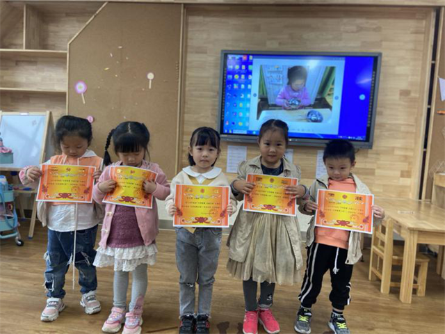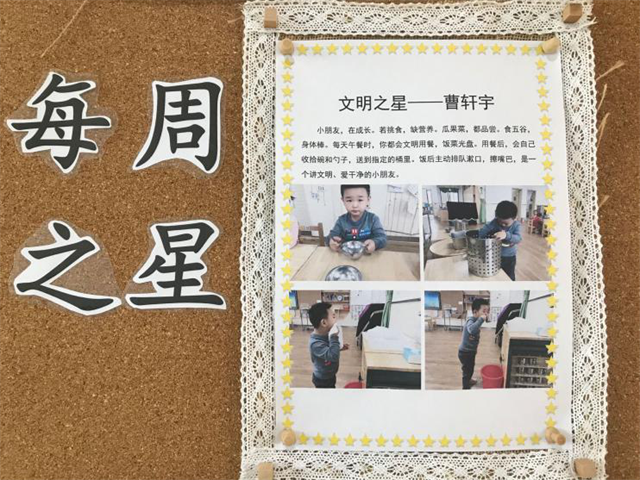 有了前面的礼仪进餐行动,那么谁是真正的文明之星呢?教师把孩子们进餐的照片投放到电视上,评选出最佳文明之星,然后给小朋友们颁发奖状,并把获得文明之星的小朋友展示在家园栏,以此作为榜样引导孩子继续文明进餐。