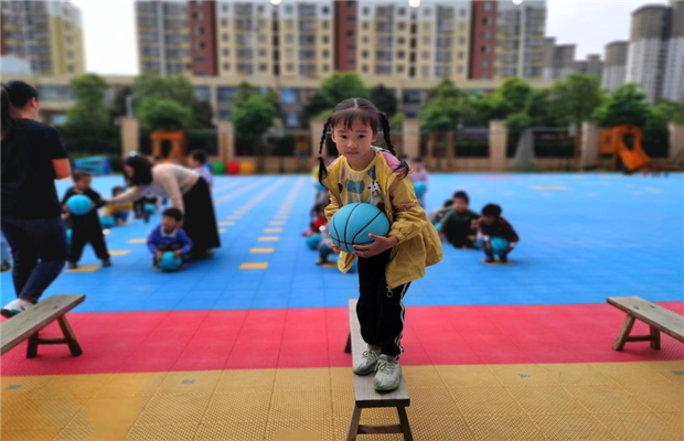 首先,张琪和赵振莹老师为我们展示的同课同构《小小旅行家》,幼儿通过修车、过独木桥的情境游戏掌握搓球技能和训练平衡能力,在游戏化的体验中幼儿们与篮球亲密接触,感受篮球游戏的快乐。