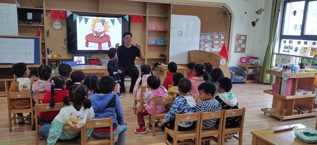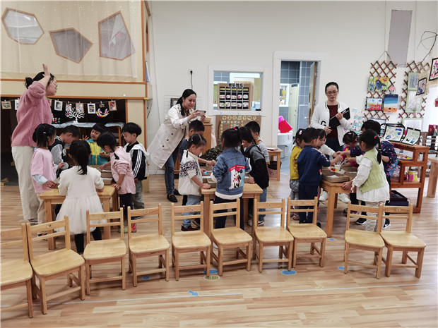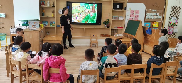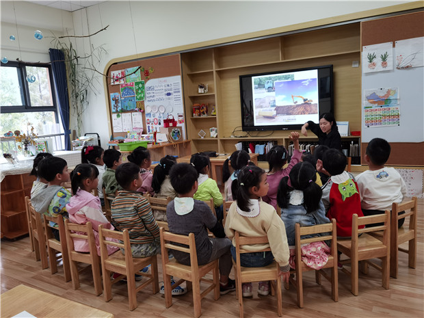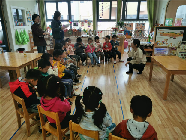 中班教师以童趣化的语言和教具吸引着孩子们的注意力,引导着孩子都积极参与进老师组织的活动。