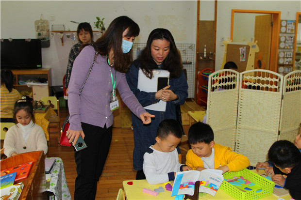 接着,各班教室的区域游戏逐渐拉开序幕,老师们一路走一路拍。走廊里,不管是那富有创意和特色的作品展示,还是那带着浓浓秋意的自然角,都引得老师们驻足停留欣赏片刻。教室里,老师们更是被区域里摆放的不同种类的绘本所吸引,被孩子们手中由绘本激发的各种游戏所吸引,被美工区有实物、有绘本、有图片等丰富的材料所吸引,还被自然材料摆放的各种高大上的作品所惊叹!眼中美好的一切都给观摩的老师们留下了深刻的印象。