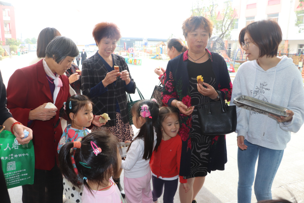 上午十点,退休教师先在领导班子的陪同下参观了图书馆、户外游戏场地、教学活动室等校园环境,美丽的校园和齐全的硬件设施让退休教师们耳目一新,看到自己曾经工作过的幼儿园发生了翻天覆地的变化,都由衷地感到高兴与自豪。参观途中,中班小朋友还将亲手制作的重阳糕送给老教师们品尝,祝他们重阳节快乐,愿他们永远健康长寿,这让退休教师感受到了“回家”的温暖。