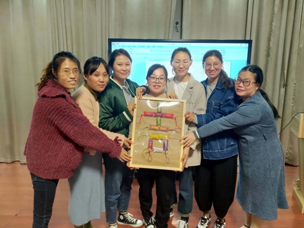 活动在邹榴玉老师的主持中拉开了帷幕,全园教职工分为小班年级组、中班年级组、大班年级组、行政和后勤组。活动开展前,各组自主选择材料,分别选择葫芦形和中国风长方形香包进行制作。活动中,邹老师首先阐述了此次活动的意义;接下来便交代活动要求;最后是制作环节,各组老师通过扫描二维码,采用个人自主学和同伴互学的方式学习、制作香包。大家在学习过程中交流、学习制作方法,在穿针引线中提升团队合作能力,一个个香包凝聚了团队的智慧、增进了教职工之间的友谊。