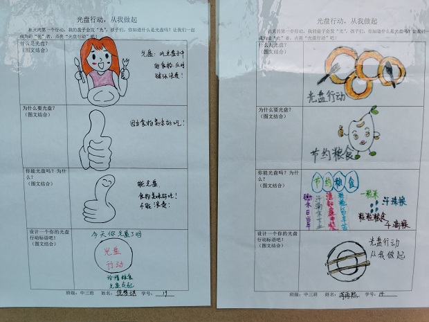 孩子们通过绘画光盘标志,表达自己的“光盘”决心,做到吃多少、盛多少,厉行节约,从我做起!
