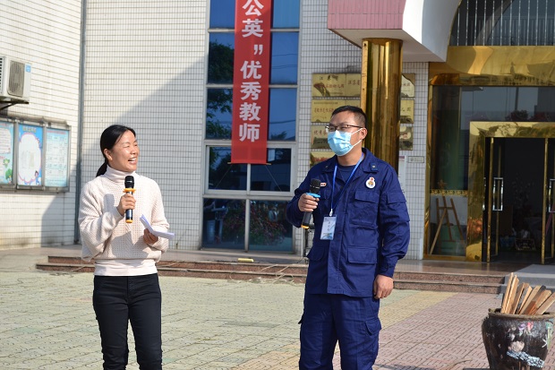 随后教师组织幼儿在大操场上以班级为单位集中并清点人数,及时把幼儿人数及安全情况报告给幼儿园安全演习总指挥陈敏霞园长。紧接着,消防员带领全体师幼认识消防车,普及消防知识,讲解正确灭火的方法与步骤,并进行了灭火演练,整个演练活动井然有序。