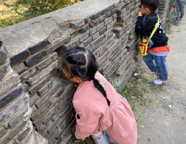 然后我们来了一个照相馆门口,他们眨巴眨巴眼睛,兴奋的扒拉着在木板门的门缝,想看看里面到底什么?就连地面都没有逃出他们的法眼,到处扣一扣,弄一弄这个与我们身边不一样的道路面。