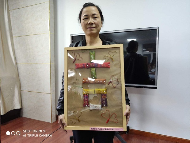 紧接着,由丁红波园长进行赠与仪式。“香包”的赠与代表着新魏幼人对杨老师的尊重与关爱,更表达了对她的美好祝福,丁园长祝福到,希望杨老师在今后的生活中健康、吉祥、快乐!