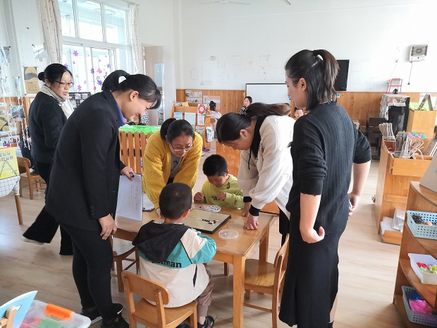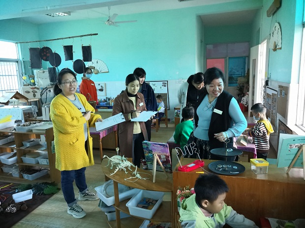11月3日上午7:55,以业务园长陆娇为首的考核组成员就进入班级,按照考核方案上的时段、分工等,分组现场观摩,考核打分。考核组成员时而仔细观察区域环境及材料投放,时而与幼儿、教师交流,时而记录检查情况,各组考核成员不放过任何一个细节,为考核负责,更为班级负责。在随后的资料检查中,大家重点针对户外和区域的观察记录进行查看,对教师们所撰写的内容进行圈圈点点,并做好批注,以期能够更好地促进教师不断提升专业能力。