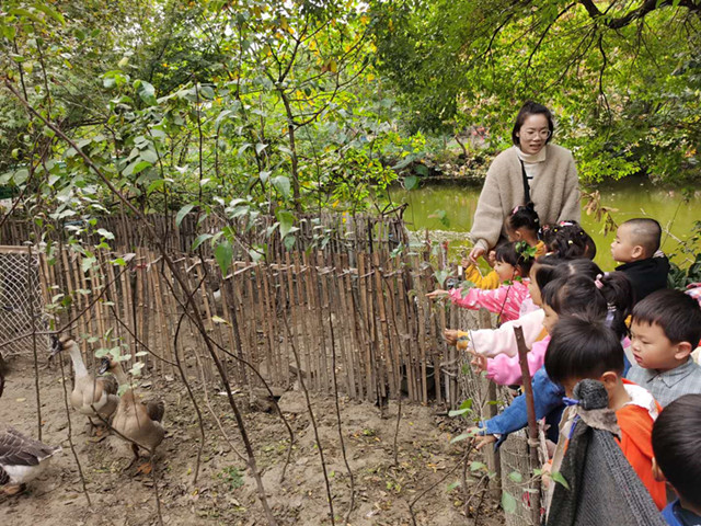 一路上孩子们欢歌笑语,踏着轻快的步伐来到了田野里,他们走在窄窄的田埂上,尽情地呼吸着泥土的清香。不时有孩子说:“这里的蔬菜好多好多哦!”“看,这里有白萝卜和红萝卜!”“嘎嘎嘎,是大白鹅!”“河里有好多小鸭在游泳呢!”……孩子们对一切都充满着好奇。体验过程中孩子们在各班老师的引导下,或观察、或探讨、或停下脚步,拔个萝卜,挖挖红薯……,在边走边看,一起感受秋天田野的美好。