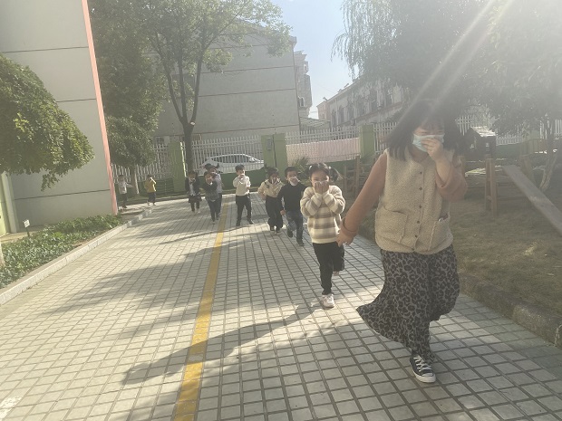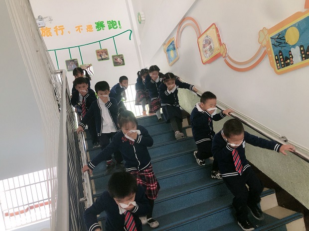 上午10点随着警报声响起,各班教师迅速按紧急预案的疏散线路带领幼儿拿起湿毛巾捂住口鼻、弯腰小步快走,分东西楼梯有序下楼,迅速撤离到安全场地,全程用了3分钟。幼儿到达指定的安全区域后,老师们维持好秩序,及时清点人数,由各年级组长上报副总指挥周唯英园长。接着周园长在舒缓的音乐声中对孩子们进行了消防逃生演练后的情绪安抚,同时在实践演练的基础上,帮助幼儿了解火警电话、火灾发生的成因,加强幼儿对消防安全的认识。