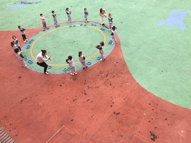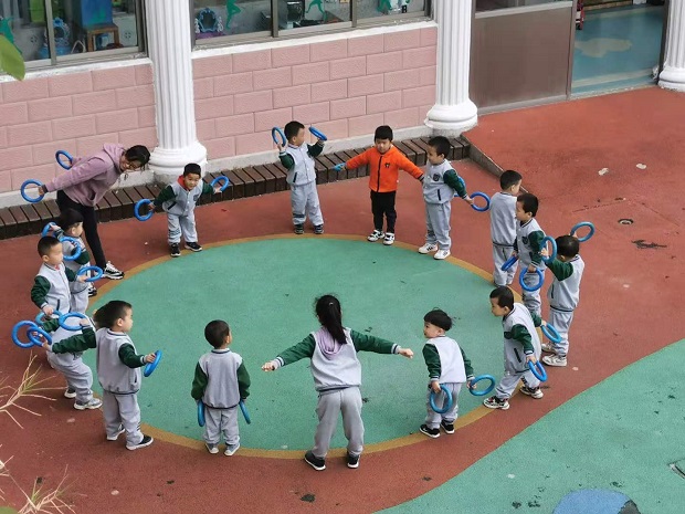 大班幼儿将绳子作为器械,在音乐中进行一物多玩,绳子在他们的手中时而变成“友谊桥”,时而又围着它转圈,时而又是他们跳跃的器械……在创意无限的空间里,幼儿不仅锻炼了身体,发散性思维也得到了提高,幼儿在积极自主的游戏中充分体验到了早操运动的愉悦。