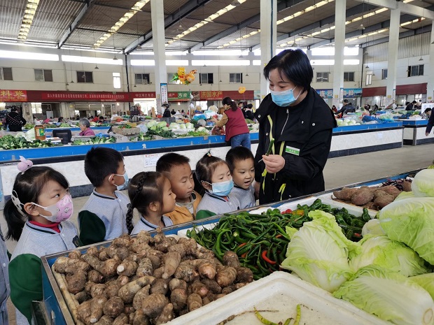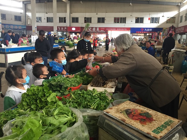 为了凸显课程生活化,丰富幼儿的生活经验,让幼儿与社会有一个直接、正面的接触,培养幼儿的社会交往技能,2020年11月9日和10日上午,百丈中心幼儿园中班组孩子分别在老师的带领下来到了百丈菜场进行“买菜”的实践活动。