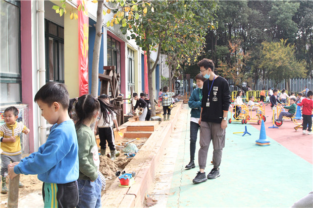 首先老师们看到的是户外活动场上孩子们自主游戏的身影:沙水区孩子们利用各种材料探秘寻宝、灌溉引流;小山坡上孩子们利用木桩、轮胎、绳索等工具攀爬滑行,丛林探险;足球场上孩子们自由分组,奔跑进球;跑道上孩子们合作搭建炭烧梯,大胆钻爬……一张张笑脸与蓝天、与草地,相互映衬,这大概就是童年该有的模样!井幼教师巧妙利用已有环境扩大孩子游戏空间,将户外活动场地变为孩子们的“游乐园”。在游戏中,老师们充分尊重孩子的意愿,将游戏的主动权还给孩子。鼓励孩子大胆、自主探索各类材料,激发孩子们户外运动锻炼兴趣与积极性,为孩子们愉快而有效地参与户外体育锻炼提供了丰富的物质基础,让孩子们在多彩的趣味游戏环境中体验快乐,收获成长!