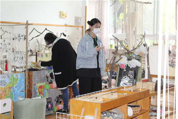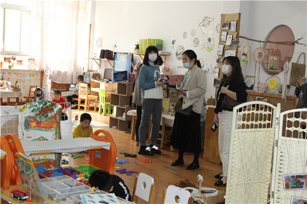 紧接着老师们来到各个班级,观摩区域活动现场。各班老师结合当下主题以及本班孩子经验、兴趣、能力,精心打造有情有趣的班级环境。同时在区域中为幼儿游戏提供丰富而有层次的操作材料以及各种支架性支持材料,引导孩子们在各个区域中自主选择,相互合作,在轻松愉悦的环境中充分体验自主学习的快乐。在观摩过程中,井幼老师结合现场向观摩教师介绍自己班级的区域活动规划、材料投放及与当前主题的融合等情况,观摩教师不断举起相机捕捉亮点。
