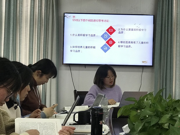 作为影响学前儿童学习与发展质量的核心因素,学习品质这一概念不仅成为了为儿童的后继学习和终身发展奠定良好素质基础的新概念和新观点,而且正在成为我们落实《指南》、“走出小学化误区”、提高学前教育质量和促进学前教育教学转型的核心要素和关键抓手。2020年12月2日中午1点,新华幼儿园全体教师围绕《热情投入的主动学习者》之第一部分关于积极学习品质的内涵、结构、价值和影响因素的理论研究展开了深入讨论。