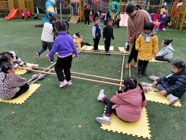 观摩前期,我园针对户外游戏活动的趣味性、材料的一物多玩、支持性环境的创设等开展了专题沙龙研讨,通过一阶段的调整,今天的户外活动场地焕然一新。