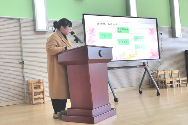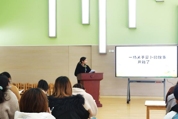 活动伊始,分别由小班顾晓霞老师、中班裴婧老师、大班吴杨老师带来了《我和蔬菜做朋友》、《嘿,萝卜》、《与你相“玉”》三个精彩的课程故事分享。分享中,我们能感受到三位老师能追随儿童的兴趣与需要,敏锐地抓取教育资源,及时展开一系列活动来支持孩子的学习行为。