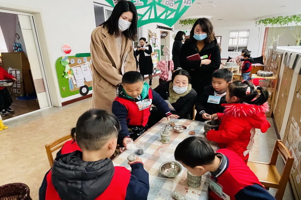 督导组专家们亲临现场观摩了区域游戏、教学活动和户外活动,随机进行教师、幼儿访谈。孩子在活动中专注的眼神、愉悦的神情、投入的状态得到了专家的赞赏。活动中处处渗透着圩幼“爱生活,享艺术,乐成长”的办园文化。
