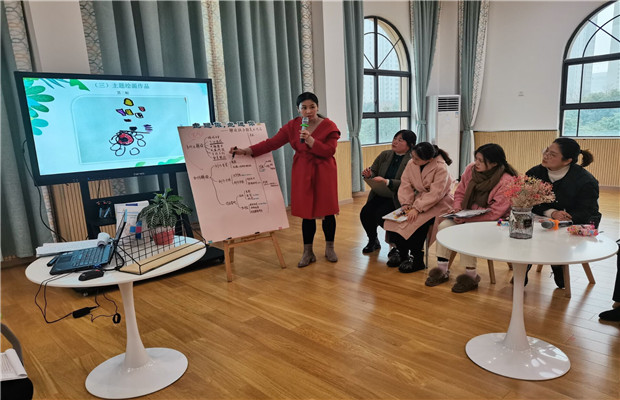 活动现场,韩萍老师带领组员围绕“为什么要解读幼儿美术作品”及“如何解读”两个话题进行了探讨。针对“为什么”,老师们各抒己见。朱丽老师通过讲述班里《蓝色太阳》的案例,指出从孩子的作品及与孩子的对话中能了解孩子的想法及内心需求。徐惠芬老师、杨婉君老师、李诗婷老师运用心理学、教育学相关理论表达了自己的看法, 表示儿童有一百种语言,通过解读作品,我们能更好地了解不同孩子的个性特点、发展水平及情感表达。由此可见,细心解读幼儿的作品,能客观地了解幼儿的游戏水平、个性情感、兴趣需求、发展阶段、审美能力,给予幼儿更好的支持。