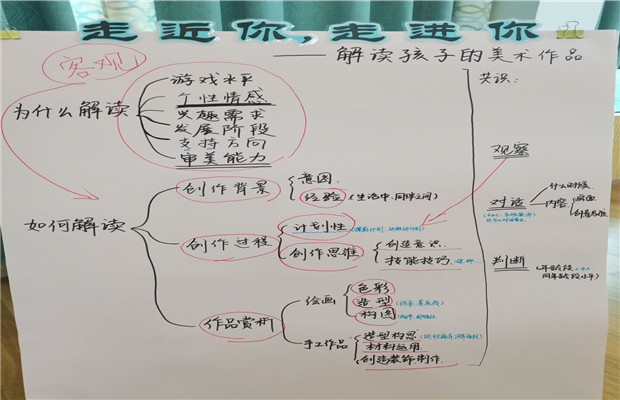 明确了解读的意义,我们又该如何去做?韩老师通过图片对比、实物展示、案例描述等方式和老师们展开了精彩的互动。《被困的小鸡》绘画作品让我们看到了孩子丰富的想象力,明白了对话的重要性;玉米小人系列手工作品让我们看到了不同孩子手工技能的发展及性格差异;消防车主题画让我们看到了同一年龄段孩子绘画水平的差异及不同孩子对同一事物的不同理解。通过大家的交流探讨,我们形成解读幼儿作品的共识:解读作品我们一般围绕创作背景、创作过程、作品本身三大方面进行解读。解读中我们要尊重幼儿的每一幅作品,以幼儿的经验为基础、观察为前提、对话为依据。针对绘画作品,我们可以从色彩、造型、构图三元素来进行分析。针对手工作品,可以从造型构思、材料运用、制作装饰三个层次进行解读。