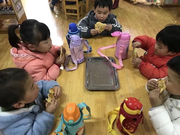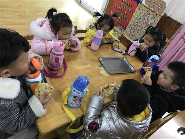 接下来就是我们的品尝美食的环节啦,小朋友们今天胃口大开,好吃的萝卜丝饼供不应求了呢!