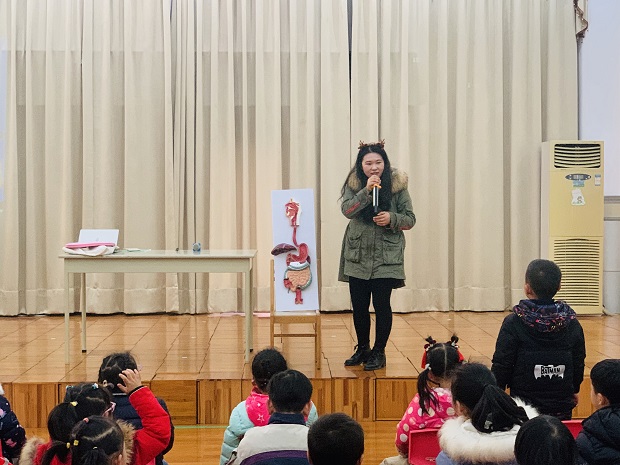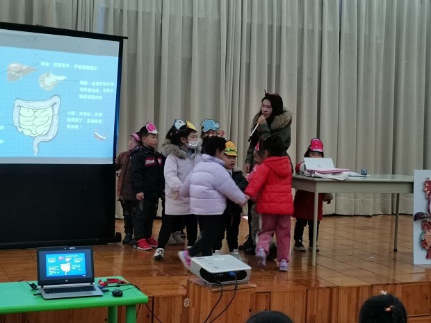 主持人向大家讲述了一个汉堡包在消化道里漫长而缓慢的旅行,它走过了口腔、食道、胃、小肠和大肠,经过消化道对它的消化和吸收,最终把对身体无用的食物残渣从肛门排泄出去。小记者们与主持人积极互动,能够正确回答很多问题,在游戏中,孩子们对照图片,结合自己的身体,了解食物消化吸收的过程,认识人体的消化器官。