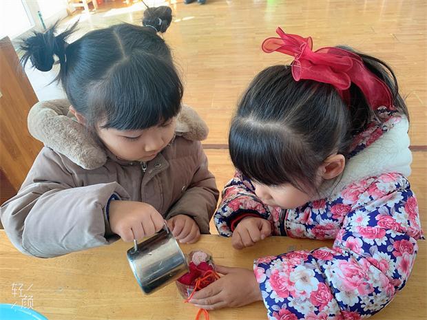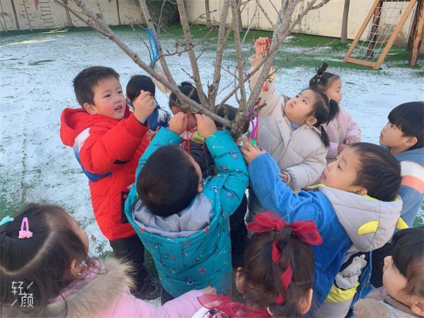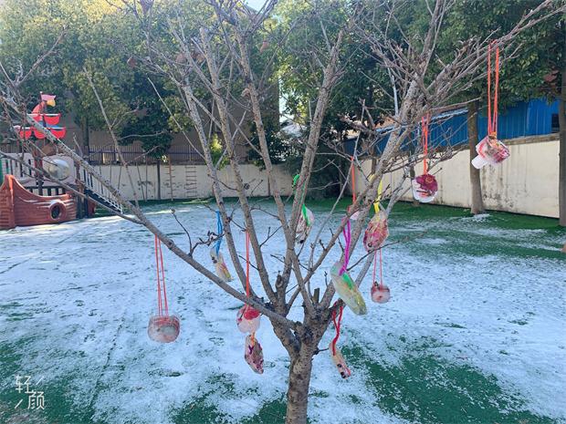 在活动之前,教师让幼儿欣赏各种冰花,给幼儿讲解冰花的制作方法,激发了幼儿的欲望。还和孩子们一起寻找小果子、小树叶等自己喜欢的自然材料。在制作冰花的过程中,我们让孩子们挑选出自己喜欢的材料,再使用磨具,添加装饰物,然后加满水,放入室外冰花制作完成。结冰后孩子们将冰花作品挂在了树枝上,供幼儿欣赏,交流,为幼儿园添加了一道美丽的风景。