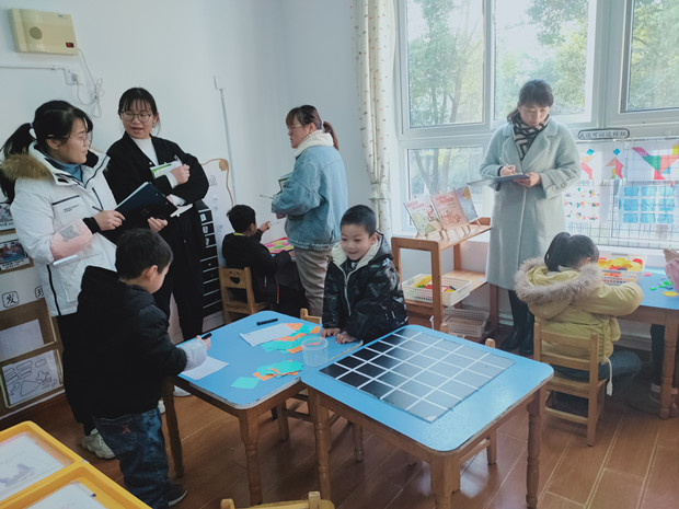 益智区包含动手操作的东西、拼图、搜集来的东西、配对游戏,以及幼儿可以拿来在桌上、地上或柜子上玩的有一定规则的游戏。当益智区里所准备的游戏材料经过仔细而审慎的安排时,幼儿就能从玩这些游戏中获得最大的好处,不管是益智区的位置还是材料的摆放方式,都会影响到幼儿使用这些材料、通过这些材料学习,以及爱护这些材料的方式。2021年1月5日上午8:30,新华幼儿园部分教师相聚在大1班进行益智区游戏的观摩及研讨活动。