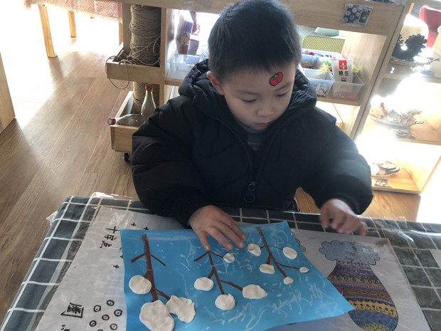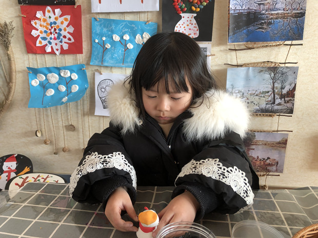 冬天在哪里?快来找一找。原来在这里呀!瞧瞧,小朋友的手多灵巧。画一画,一片片洁白晶莹的雪花从半空中飘落;做一做,一棵棵挺拔的大树傲立在大雪中;捏一捏,一个个可爱俏皮的雪人儿在和我说话。小朋友的脑袋里充满着对冬天的无限遐想,他们用自己的小手将冬天展现得淋漓尽致。
