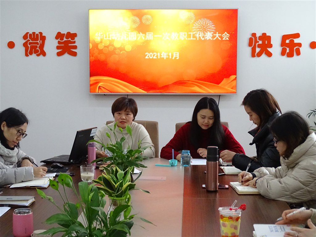 2021年1月25日上午,来自华山幼儿园行政、一线教师、保育员、食堂人员等共23名教职员工代表齐聚二楼会议室召开了华幼六届一次教代会,本次会议由工会主席丁红霞主持。