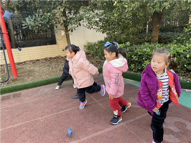 民间游戏具有浓厚的趣味性,内容丰富、取材方便,简单易学,孩子们也非常喜欢。他们有的进行着丢沙包游戏,有的将民间游戏和我们幼儿园的现有材料进行组合,在传承民间玩法的同时,进行着自己的创新游戏。在游戏中,孩子们不仅感受到了民间游戏的魅力无穷,还锻炼了幼儿的肢体力量及协调性,培养了孩子的规则意识及协作精神。