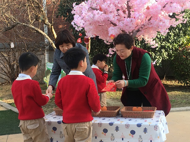 花样一:幸福树下有红包。豪幼赵晓丽园长、倪元美副园长站在幸福树下亲自为每个孩子送上一个红包,传递一份祝福。接过红包的孩子多半是喜悦的、兴奋的,更是充满好奇的。“园长妈妈,为什么红包里不装钱,装数字呀?”“红包里的符号又代表什么意思呢?”“这是秘密哦,等会进到教室,你就知道了”。