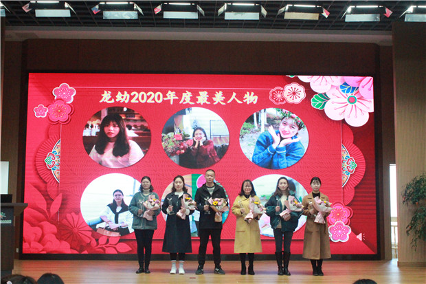 紧接着进行的是“点赞优秀绘新景”环节。在2020年,龙幼人走在且思且行的路上,从书中学理论策略,从实践中总结方法,一个善于学习的团队总会有很多惊喜在路上等待。在过去的一年中,龙幼人在省级“师陶杯”教育科研论文评比、龙幼优秀课程案例评比、龙幼保育员“自理能力”知识点梳理大赛、龙幼食堂“厨师食材大摆盘”评比等环节中获得了累累硕果,同时还涌现出了一批年度先进个人、宣传报道先进个人、优秀党员等,这些都是我们学习的排头兵和不断靠近的标杆。