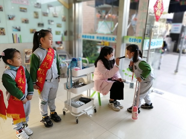 开学第一天,老师们早早准备好,迎接宝贝们回家。入园时刻,晨检老师细心地帮宝贝晨检,对每个幼儿认真的进行体温测量、手部消毒以及口腔检查。礼仪娃们更是用一个个微笑迎接宝贝们的到来。