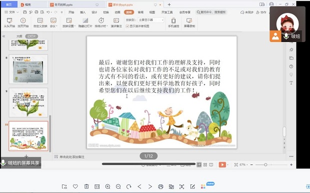 会议中各班级老师通过PPT形式,向家长分别介绍了班级基本情况、中班幼儿年龄特点,幼儿在园一日生活、学习、游戏活动,幼儿园节日开展的各项活动、家园配合等。