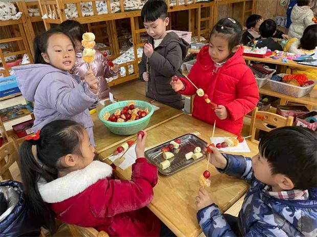 为了让孩子们体验元宵节浓浓的节日气氛,感受庆祝元宵节的快乐,上午幼儿园大班级组开展了“包汤圆”的活动,孩子们在老师的组织下,“做元宵”、“尝元宵”、“说元宵”,了解了做元宵的整个过程:和面、着色、搓元宵,并亲自动手制做各种颜色的元宵,当孩子们津津有味的品尝着自己做的美味元宵时,脸上露出了自豪的神情。下午,老师和孩子们一起动手制作美丽的花灯:有小牛灯,小桔灯,彩灯等,美丽的自制灯笼给孩子们带来了别样的元宵。还有各种水果在孩子手中变成一串串糖葫芦时,孩子们的脸上洋溢着幸福的笑容。
