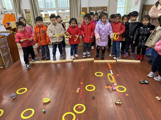 创意游戏:套圈圈。套圈圈是一个街头巷尾都能见到的民间传统游戏,中3班的孩子们一起收集了五花八门的玩具,创设了趣味性十足的套圈场,大家摆一摆、套一套,其乐无穷。