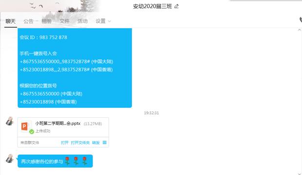 本次家长会以班级为单位,采用线上会议的方式进行。通过语言的形式向家长介绍了本学期教育重点、班级基本情况反馈、卫生保健工作和家园共育等多方面的注意事项。家长们准时在各班群里签到,随后,老师们与家长们进行了线上答疑,线上互动和游戏。会议结束后,许多家长敞开心扉,与老师交流自己的教育困惑。
