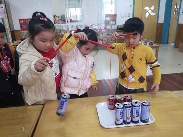 这边的小小游戏家们两两合作,相互配合,有的搭档稳中求胜;有的搭档快在速度;有的搭档小心翼翼地前进,加油声、呐喊声、笑声、掌声,声声入耳,幼儿园成了一片欢乐的海洋。
