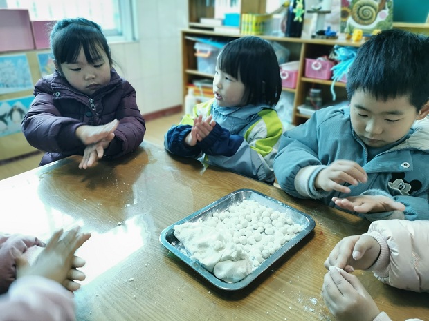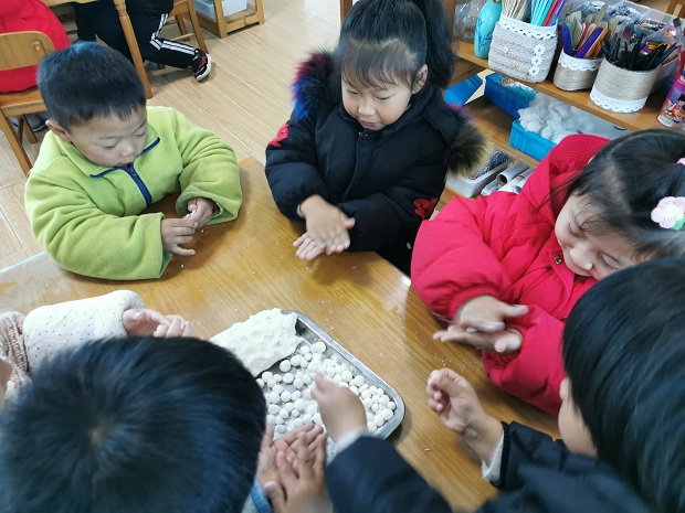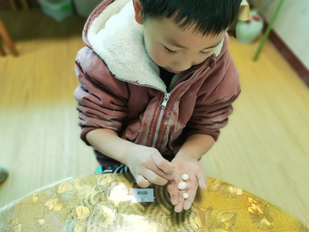 孩子们洗干净小手,用准备好的糯米粉团搓小元宵,一双双灵活的小手在搓搓按按中,做出了一颗颗小巧的汤圆,尽管汤圆的形态各异,有的大,有的小,但是孩子们忙的不亦乐乎。