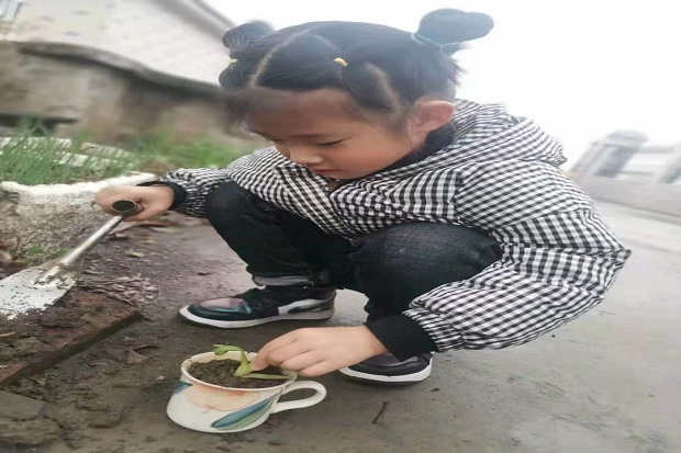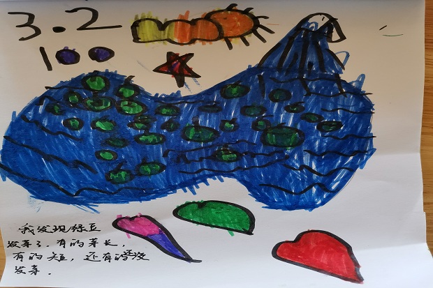 接着孩子们便开始自主种植。孩子们把家里闲置的废旧物品进行改造装饰,自己挖土浇水种植,给植物做身份证。每天,孩子们自主去观察自己的“宝贝”,及时浇水、搬到室外晒太阳,大家都细心观察着“宝贝”生长的微妙变化。 每次观察,孩子们也会聚集在一起相互交流,“我的青菜怎么还没发芽啊?”、“我的绿豆发芽了,有的长,有的短,有的还没发芽。”、“我水培的花生今天还是没发芽,它什么时候发芽啊?”、“绿豆、黄豆谁先发芽呢?”……