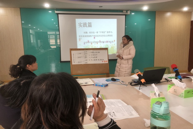 接着主持人让老师们自主阅读“户外区中老师的责任是什么?”,并建议老师们找出你认为最有用的一段话,谈谈对它的理解。蔡老师针对“有的挑战太大了,幼儿可能突然非常害怕会退下来……”她结合这段话讲述了踩高跷的案例,在失败中总结经验,最后让孩子由易到难,体会到成功的喜悦。王燕老师针对“户外区幼儿如何做观察……”这段话,讲述了自己在教室里对孩子的观察过程,觉得以后在自己工作中对孩子要多次进行观察,采取不同的有针对性的教育方法。蒋侃老师针对“尽可能让幼儿去感受到自己是很有能力的……”这段话,她阐述了当孩子遇到困难的时候,要用语言去激励孩子继续挑战,鼓励他们尝试新事物……老师们的精彩交流进一步明确了我们的职责所在。