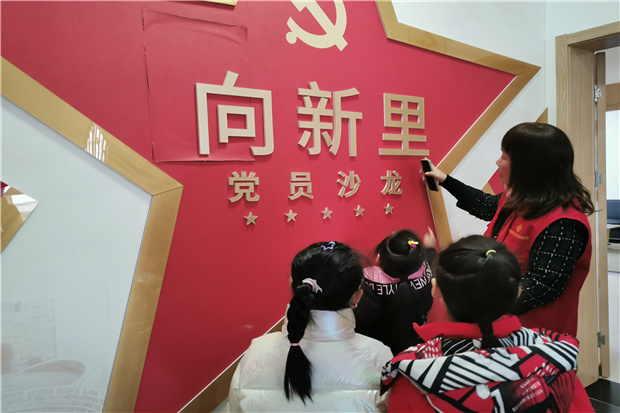 孩子们来到了心心念念的社区,原来社区距离我们的幼儿园并不远,孩子们对眼前的地方感到很新奇。府新社区的方玉兰主任带领孩子们一起观看了新北区府新社区的宣传纪录片,当说到各个小区的时候,小朋友们都脱口而出:“这是我住的小区”。方主任和吕主任给孩子们讲述了她们的日常工作,在疫情期间不眠不休,为进出小区的人量体温、宣讲防疫知识;为年迈的爷爷奶奶买菜;慰问空巢老实人,春节期间为孩子们创设有趣的节日游戏……这些事迹深深地感动了在场的每一个人。最后方主任说:“作为一名中国共产党,我们必须时刻牢记不忘初心,为人民服务。”孩子们摸了摸方主任衣服上的党徽,和方主任共同在党旗下合影,红星闪闪播种进幼小的心灵。