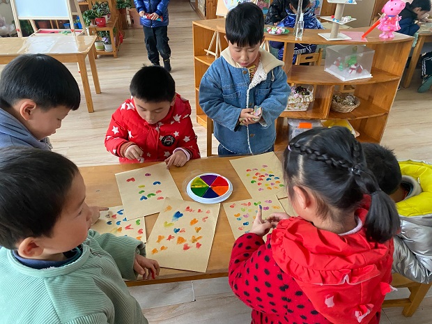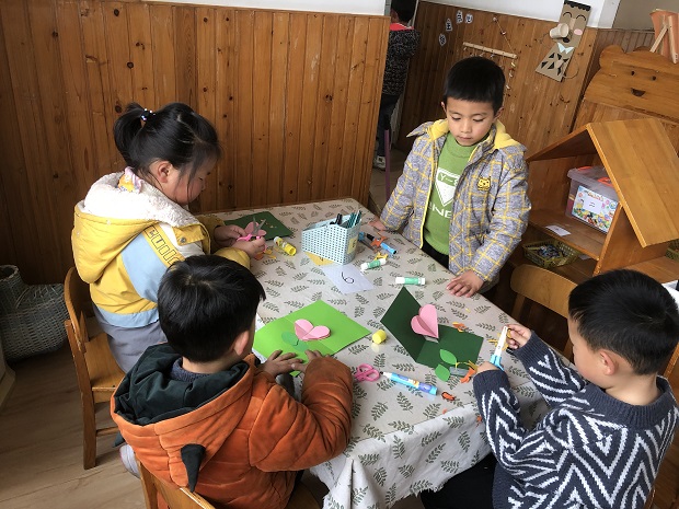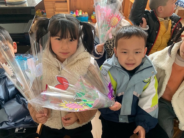 大班组的幼儿动手能力相对较强,开展了“我做礼物送给妈妈”的活动,大一班的孩子利用了透明塑料纸和白纸制作了一束美丽的纸花,大大的一束花捧在手上,可真有气质呢。大二班的孩子用小手点一点,油画棒画一画,瞧,一幅美丽的手指花完成啦!大三和大四的孩子们用卡纸、剪刀、黑笔制作了美丽的贺卡,孩子们把自己的祝福画在贺卡里面,承载着最真挚的祝福。