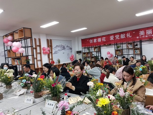 爱花,是对美好生活的一种爱惜。喜欢花的人,往往都是心向阳光。今天的庆祝活动,邀请了春江街道可馨花房的花艺师刘文林女士来到现场,为大家讲解插花之道。活动现场,大家热情高涨,一剪一插,幸福和满足洋溢在脸上。原本普通的鲜花经过大家的巧妙构思、搭配、点缀,变成了一盆盆赏心悦目、独具匠心的花艺作品。